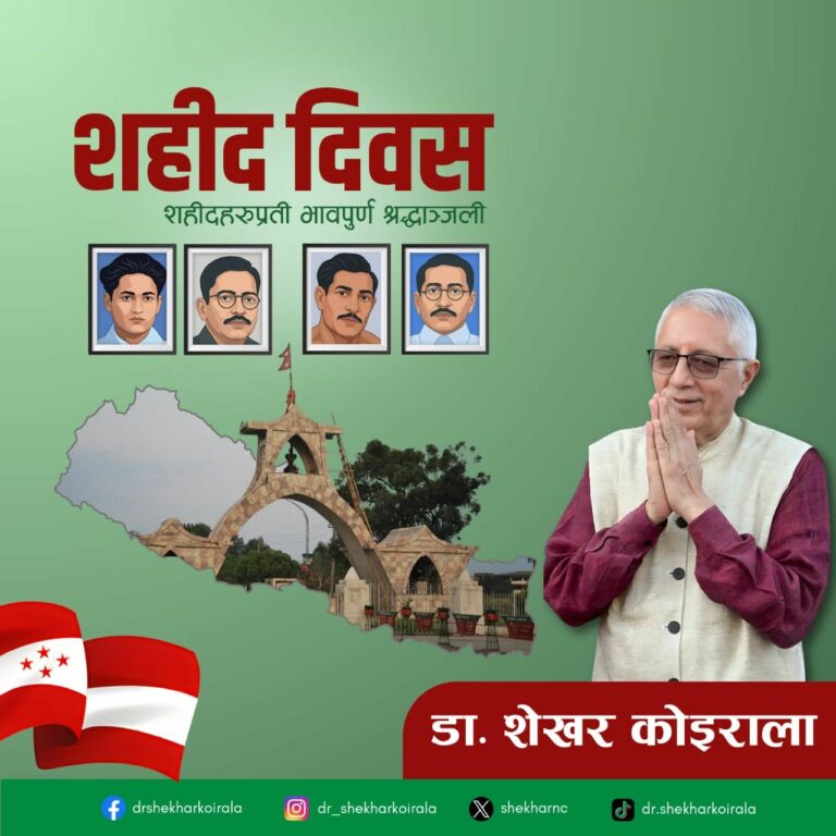 शहीद दिवसको अवसरमा नेपाली कांग्रेसका नेता डा. शेखर कोइरालाले देशका लागि बलिदान दिएका शहीदहरुप्रति भावपूर्ण श्रद्धाञ्जली अर्पण गर्नुभएको छ।