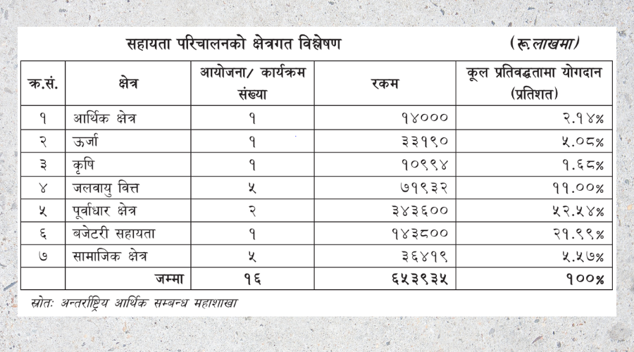 चालु आर्थिक वर्षको ६ महिनामा पूर्वाधार क्षेत्रका २ आयोजनामा ३४ अर्ब ३६ करोड रुपियाँ वैदेशिक सहायता प्रतिबद्धता आएको छ । अर्थ मन्त्रालयका अनुसार बजेटरी सहायताअन्र्तगत १४ अर्ब ३८ करोड रुपियाँ, जलवायु वित्तका ५ आयोजनामा ७ अर्ब १९ करोड ३२ लाख, सामाजिक क्षेत्रका ५ आयोजामा ३ अर्ब ६४ करोड १९ लाख, ऊर्जा क्षेत्रको एउटा आयोजनाका लागि ३ अर्ब ३१ करोड ९० लाख रुपियाँ गरी कुल १६ आयोजनाका लागि ६५ अर्ब ३९ करोड ३५ लाख रुपियाँ रहेको छ ।