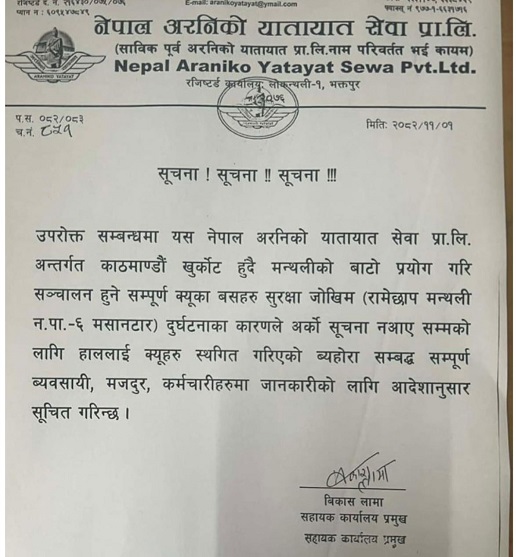 नेपाल अरनिको यातायात सेवा प्रा.लिले मसानटारमा भएको दुर्घटनालाई मध्यनजर गर्दै यात्रु, चालक र सहचालकको सुरक्षामा चुनौती देखिएकाले हाललाई सेवा बन्द गर्नु परेको स्पष्ट पारेको छ। सहायक कार्यालय प्रमुख विकास लामाले हस्ताक्षर गरेको सूचनामा अनुसार सुरक्षा संवेदनशीलताका कारण यो कडा कदम चालिएको उल्लेख छ ।