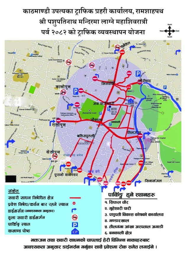 काठमाडौंमा यस वर्षको महाशिवरात्रि पर्वलाई लक्षित गर्दै उपत्यका ट्राफिक प्रहरी कार्यालयले पशुपतिनाथ मन्दिर आसपास विशेष सुरक्षा तथा ट्राफिक व्यवस्थापन योजना लागू गरेको छ।