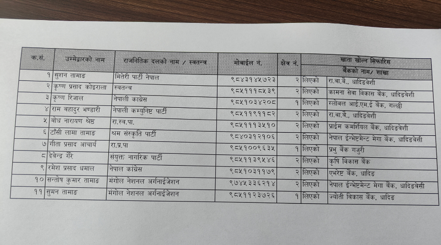 निर्वाचन क्षेत्र नम्बर २ का मितेरी पार्टी नेपालका सुशन तामाङ, स्वतन्त्र कृष्णप्रसाद कोइराला, नेपाली कम्यूनिष्ट पार्टीका रामबहादुर भण्डारी, रास्वपाका बोधनारायण श्रेष्ठ, श्रम संस्कृति पार्टीका टासी लामा तामाङ, संयुक्त नागरिक पार्टीका देबेन्द्र गैरे, नेपाली काँग्रेसका रमेश धमला, मंगोल नेशनल अर्गनाइजेशनका सन्तोष कुमार तामाङले मात्र निर्वचन खाता खोल्न सिफारिस लानु भएको जिल्ला निर्वाचन अधिकारी गुरुङले जानकारी दिनुभयो ।