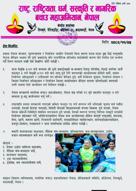 नागरिक बचाउ महाअभियान, नेपालले आफ्ना केन्द्रीय अध्यक्ष दुर्गा प्रसाईको तत्काल रिहाइको माग गर्दै प्रेस विज्ञप्ति जारी गरेको छ। मंगलबार जारी विज्ञप्तिमा सरकारले बिना कारण पक्राउ गरी राजनीतिक प्रतिशोध साधेको आरोप लगाइएको छ।