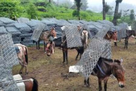 सोलुखुम्बु थामेमा पर्खाल निर्माणका लागि खच्चडमार्फत तारजाली ढुवानी