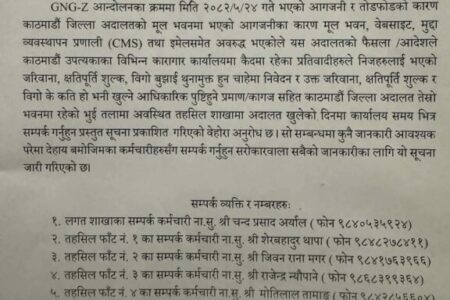 काठमाडौं जिल्ला अदालतको CMS प्रणाली अवरुद्ध,कैदीलाई जरिवाना बुझाउन तेस्रो भवनको तहसिल शाखामा सम्पर्क गर्न आग्रह