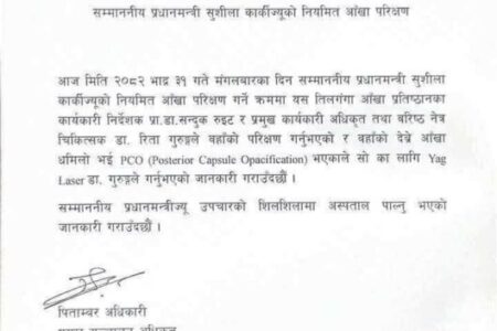 प्रधानमन्त्री सुशिला कार्कीको मंगलवार तिलगंगामा आंखाको उपचार गरियो