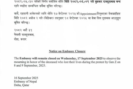 राष्ट्रिय शोकका कारण नेपाली राजदूतावास दोहा बन्द रहने