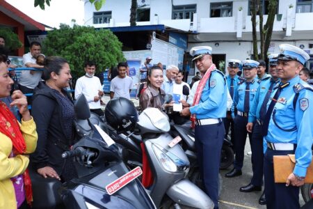 ट्राफिक प्रहरीद्वारा २० वटा दुईपाङ्ग्रे सवारी साधन सम्बन्धित धनीलाई हस्तान्तरण