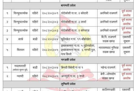 बाढीपहिरोका कारण देशका विभिन्न राजमार्गमा ६ स्थानमा सडक पूर्णरुपमा अवरुद्ध
