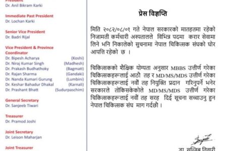 विशेषज्ञ चिकित्सकको तह घटाइएको सूचनाप्रति चिकित्सक संघको आपत्ति